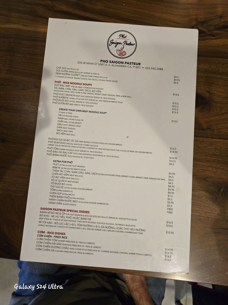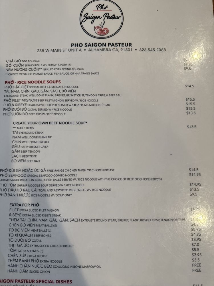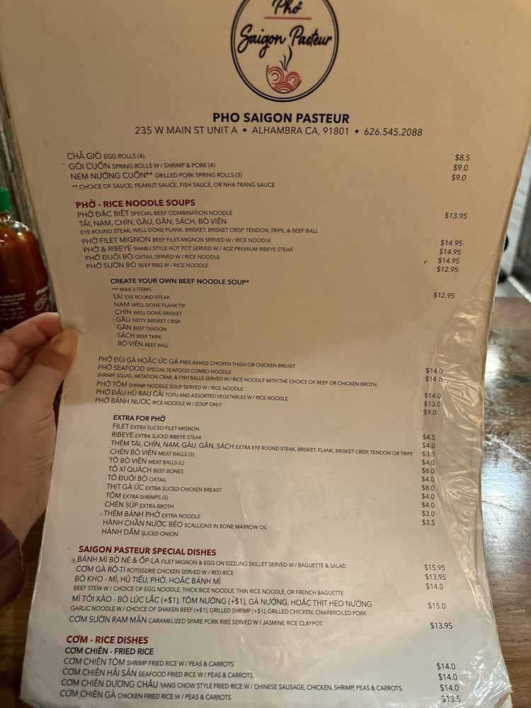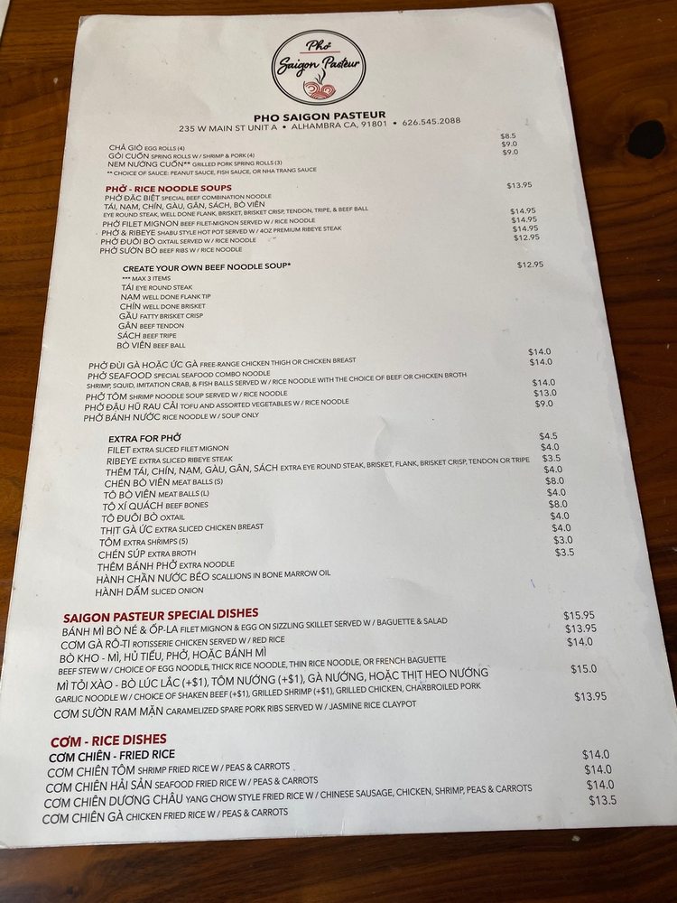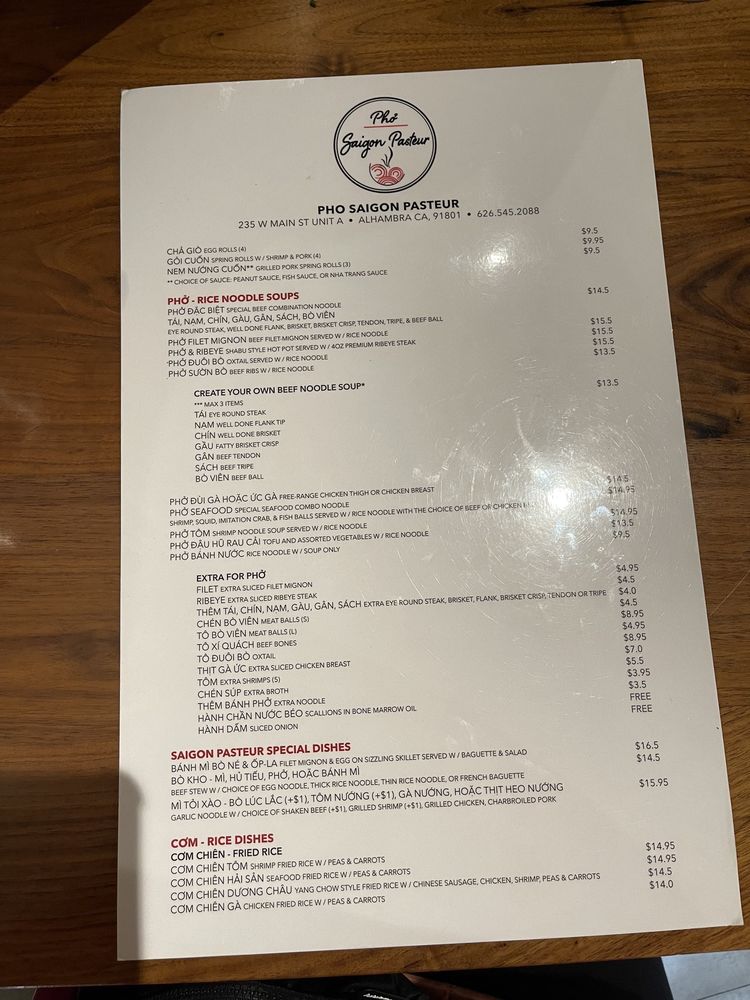 Pho Saigon Pasteur, a Vietnamese restaurant located in Alhambra, offers a well-rounded dining experience with a focus on pho and other traditional dishes. Customers praise the attentive service, modern decor, and comfortable ambiance. Highlights include the Banh Mi Bo Ne, a cream-based sauce dish that stands out, and the Pho Dac Biet loved by many. Despite some mixed reviews on meat quality, the overall consensus is positive, with patrons returning for the delicious food and friendly service. The restaurant also offers outdoor seating, catering, and happy hour specials. Whether you're craving a comforting bowl of pho or exploring new Vietnamese flavors, Pho Saigon Pasteur is a solid choice for a satisfying meal.